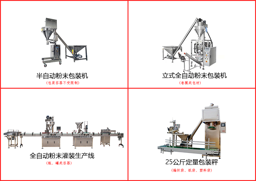 全自動(dòng)粉體包裝機(jī)又可分為袋裝全自動(dòng)粉體包裝機(jī)、瓶裝全自動(dòng)粉體灌裝機(jī)、罐裝全自動(dòng)粉體包裝機(jī)。
