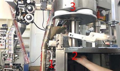 量杯計(jì)量裝置相對(duì)電子秤稱(chēng)重下料的精度差一點(diǎn),但是實(shí)惠。量杯計(jì)量裝置下料與封口不一致,需要調(diào)整量杯料位與下料封口的時(shí)間,如果下料快,需要把1的手柄打下來(lái),然后把2的凸輪托起來(lái),如果下料快,把轉(zhuǎn)盤(pán)標(biāo)示3往逆時(shí)針?lè)较蜣D(zhuǎn)一點(diǎn),如果下料慢,則把轉(zhuǎn)盤(pán)往順時(shí)針?lè)较蜣D(zhuǎn)一點(diǎn)。