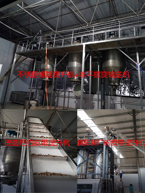 但有一個客戶就比較特殊,他家是做香菇深加工,做香菇萃取的,要把香菇提升到不同的反應(yīng)釜中,我們給做的集中加料系統(tǒng),斜式不銹鋼螺旋提升機(jī)+水平不銹鋼螺旋輸送機(jī)組成。垂直提升高度6米左右,螺旋管長度將近9米。我們都知道,螺旋提升機(jī)存料,無法提升干凈。問題就出在這里,客戶使用頻率不高,如果趕上天氣不好,空氣濕度大,好多天才開一次設(shè)備,斜螺旋管中的干香菇吸潮會在中吊附件形成堵塞,從而造成設(shè)備不可逆性損傷,常見的是葉片破壞。后來更換了提升機(jī),客戶選擇的是皮帶提升機(jī)。(后邊有視頻)